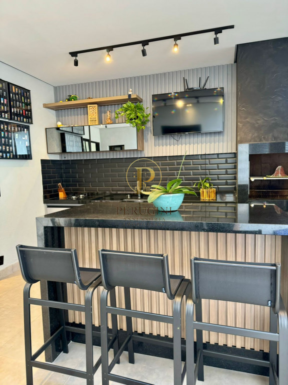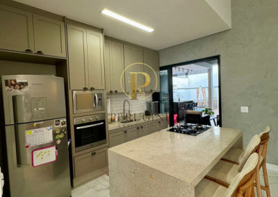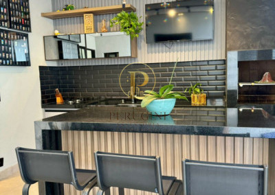 Espaço gourmet com churrasqueira, ilha e integração à área externa